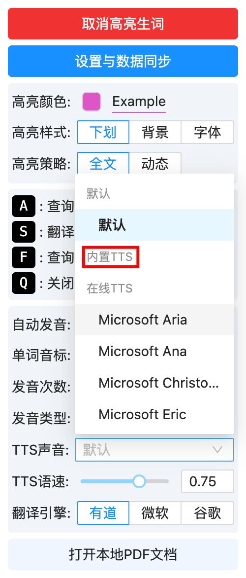 - 添加完成后,插件中 TTS 声音 选择框可以选择内置的 TTS 发音。