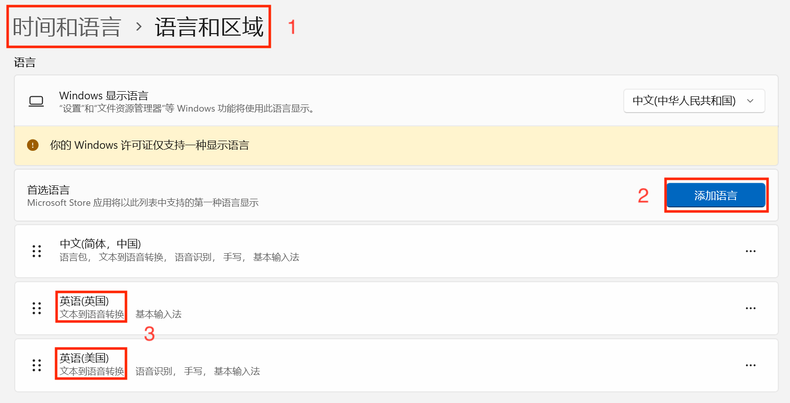 - 点击「添加语言」,添加英语(美国)、英语(英国),最终如图设置。