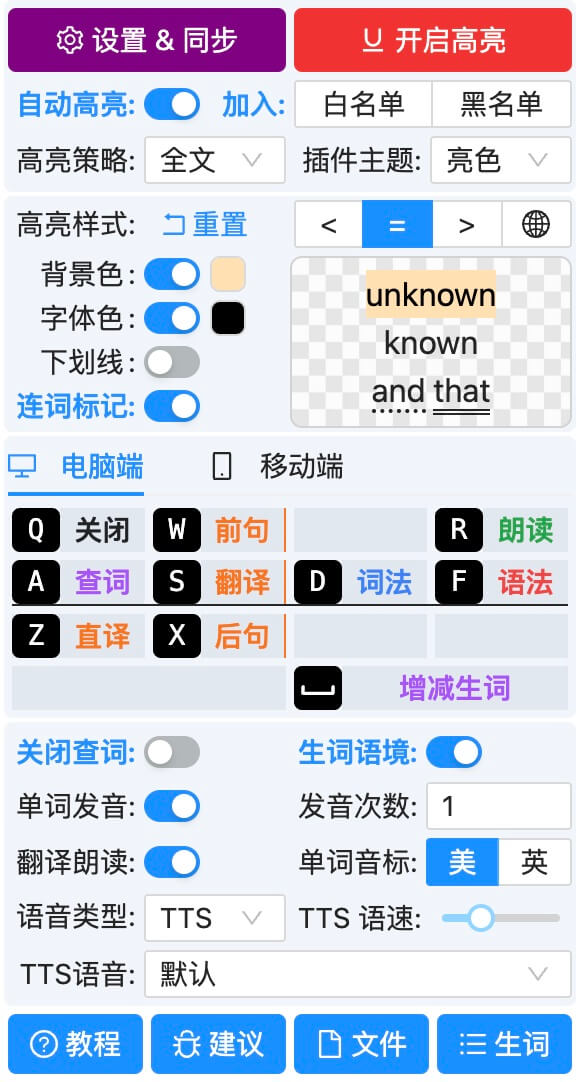 - 自动高亮: 如当前网站为英文网站,自动开启高亮。